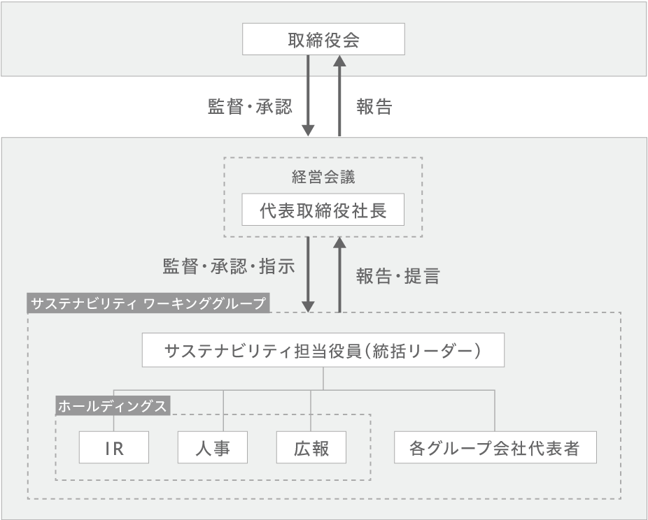 ラクーングループにおけるサステナビリティの取り組みは、代表取締役社長のコミットメントのもと、担当取締役を中心に各部門・各グループ会社と連携したワーキンググループを組織し全社的に推進しています。ワーキンググループから経営会議に随時報告・提言を行い、経営会議にて審議・承認のうえ、定期的に取締役会へ報告を行っています。取締役会は管理・監督及び重要事項の承認を行っています。また、監査等委員会は、サステナビリティ全般に関わるリスクを認識し適宜報告を求めています。