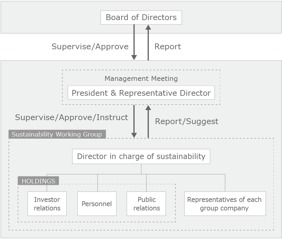 The effort for sustainability in the RACCOON Group, under President & Representative Director’s commitment, we have organized the working group in cooperation with each division/group company, centered on directors in charge, and are promoting it company-wide. The working group makes reports and suggestions to the Management Meeting as needed, and such reports and suggestions are deliberated and approved at the Management Meeting and then reported to the Board of Directors on a regular basis. The Board of Directors is responsible for management, supervision, and approval of important matters. Also, the Audit & Supervisory Committee recognizes the risks regarding all aspects of sustainability, and requires proper reporting.