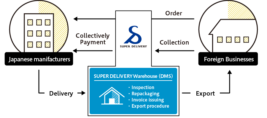 SUPER DELIVERY is developing "SD export" where you can sell products not only in Japan but also in foreign countries. In normal export sales, exporters need to handle multiple procedures such as selling and purchasing contracts with suppliers, submitting documents to customs and sending invoices of trading products to importers. Those procedures require a lot of time and effort. Plus, exporters need also to issue L/C settlements depending on credit conditions. "SD export" solves all these problems and realizes smooth transactions.