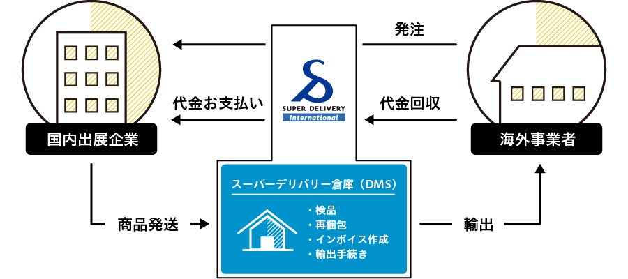 スーパーデリバリーは日本国内だけではなく海外への販売も可能な「SD export(エスディーエクスポート)」を展開しています。通常、輸出販売を行う際に輸出者は取引先との売買契約や、税関への書類の提出、取引商品のインボイスを輸入者宛に送付するなど複数の手続きが必要となり、手間と時間を要します。また商品の代金支払いに関しては、信用状況に応じて L/C 決済を発行するなど、日本国内の取引と異なりいくつもの手順を踏む必要があります。